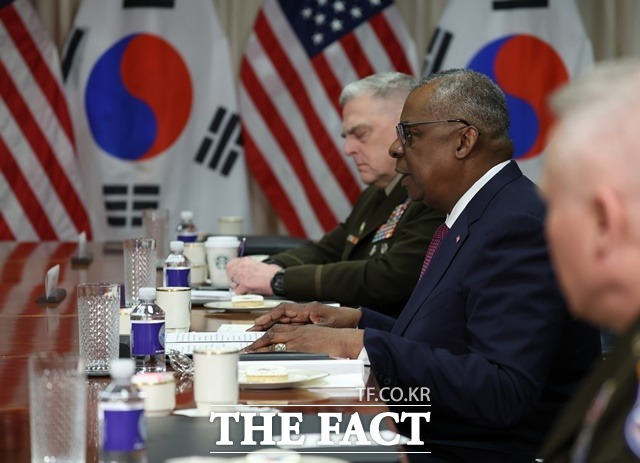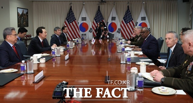 오스틴 장관은 윤 대통령의 펜타곤 방문을 환영하면서 "대한민국을 방어하기 위한 미국의 의지는 철통과도 같다"며 "저희들의 확장억제 공약 역시 그렇다. 여기에는 완전한 범위의 미국의 능력, 즉 재래식, 핵 및 미사일 방어 능력이 모두 포함된다"고 말했다.
