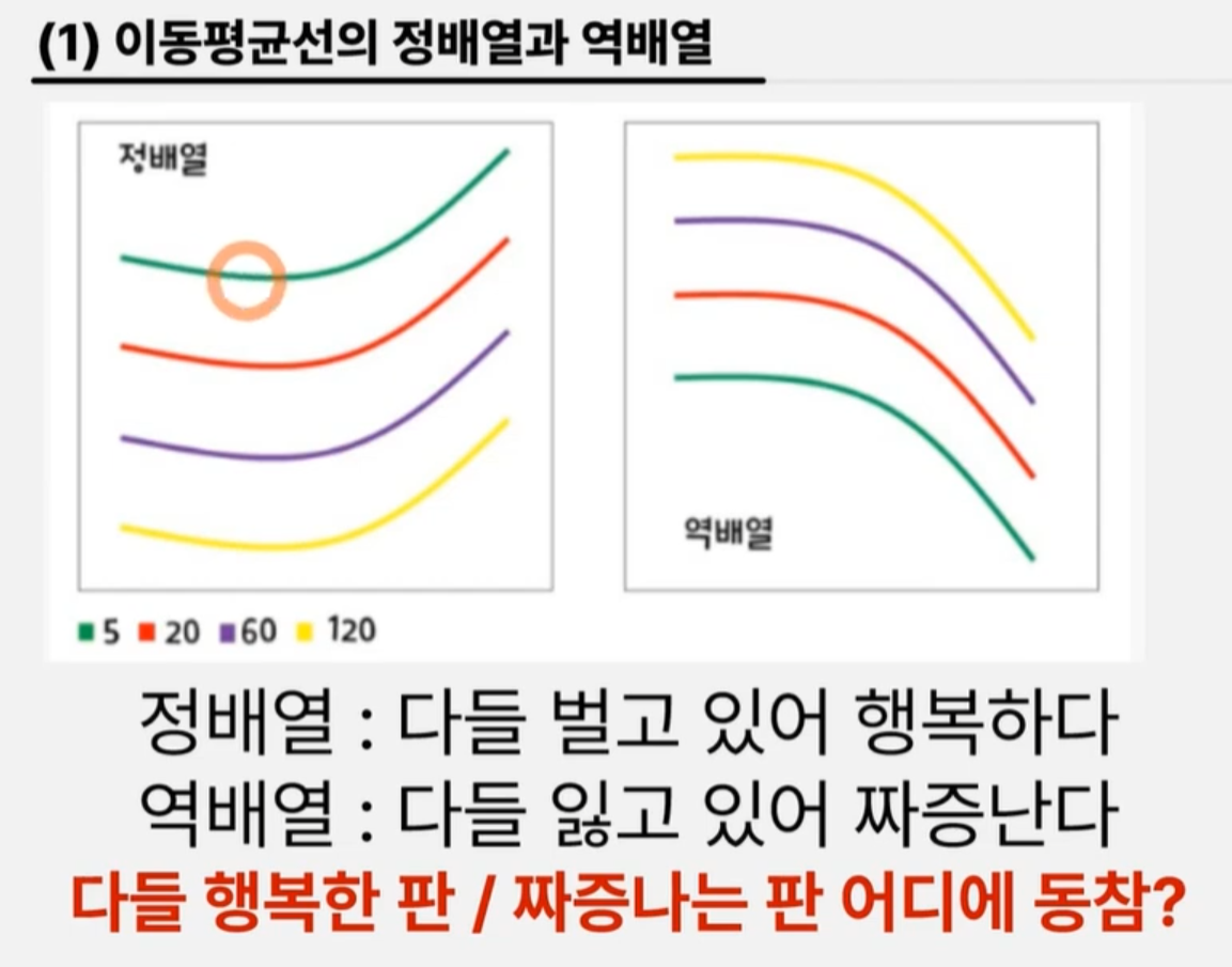 역배열 – 정배열의 반대 120 밑에 60일, 60밑에 20, 20밑에 5일선이 있는 경우