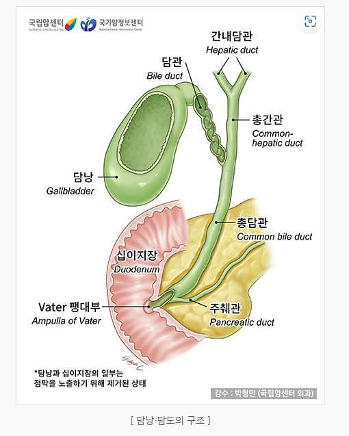 지방의 소화를 돕는 담즙(膽汁, 쓸개즙)이 간에서 분비되어 십이지장으로 흘러 들어가기까지의 경로를 담도(膽道, 쓸갯길, biliary tract)라고 하며, 간내 담도와 간이 담도로 나뉩니다. 간 아래쪽에 붙어 있는 담낭은 담즙을 일시적으로 저장하는 창고 같은 곳으로, 담낭관이라고 하는 좁은 관을 통해 담도와 연결되어 있습니다. (담즙은 췌장에서 분비되는 췌액과 달리 소화효소가 없지만, 주성분의 하나인 담즙산이 지방질을 유화하여 소화‧흡수가 잘 되도록 합니다.) 담도는 전체적으로 나뭇가지 같은 형태를 보입니다. 그래서 영어로 담도를 집합적으로 ‘biliary tree’라고도 합니다. 간 곳곳에 퍼져 있는 가느다란 모세(毛細) 담도들이 단계적으로 합류하면서 굵어져 좌측과 우측의 큰 담관을 형성하고(이를 간관[肝管]이라 합니다). 간에서 나올 때 이 두 개의 관이 하나로 합칩니다. 간에서 만들어진 담즙은 간내 담도, 담낭(쓸개), 간이 담도를 차례로 거쳐 십이지장에 도달하게 됩니다.