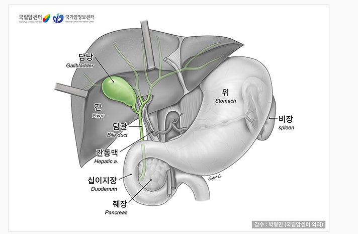 간에서 분비된 담즙(쓸개즙)을 십이지장, 즉 샘창자까지 운반하는 경로를 담도(膽道, 쓸갯길, 담관)라고 하며, 담낭(膽囊, 쓸개, gallbladder)은 간관(肝管)을 타고 나온 담즙을 담낭관이라는 가느다란 나선형의 관을 통해 받아들여 농축한 뒤 일시적으로 저장했다가 내보내는 창고 같은 곳입니다. 길이가 7~10cm 정도로 작은 담낭은 간 아래쪽에 붙어 있고 간외(肝外) 담도와 연결되어 있습니다. 담즙은 간에서 만들어져서 간내 담도, 담낭, 간외 담도를 차례로 거쳐 십이지장에 도달하게 됩니다. 담즙은 췌장(이자)에서 분비되는 췌액과 달리 소화효소가 없지만, 주성분의 하나인 담즙산이 지방질을 유화하여 소화‧흡수가 잘 되도록 합니다.