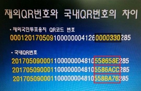 ▲▲ 재외투표 QR코드와 국내 사전투표 QR코드의 차이 19대 대선 재외투표용지 QR코드와 국내 사전투표용지 QR코드를 QR코드 리더기로 스캔해 나타난 숫자 ⓒ 스카이데일리 제공관련사진보기