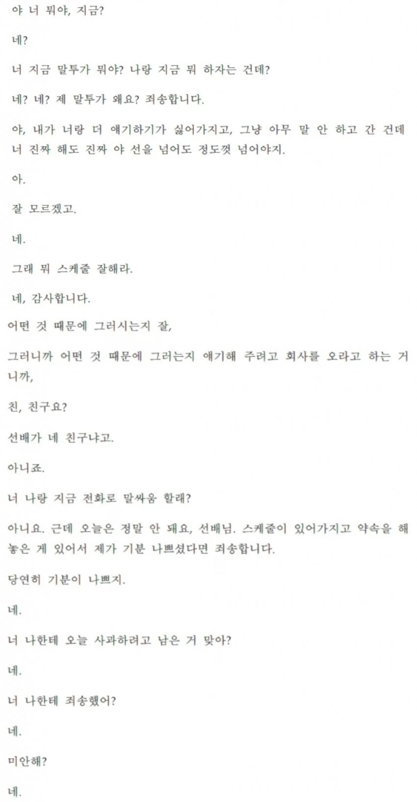 괴롭힘을 주도한 것으로 추정되는 인물과의 통화 녹취록도 공개됐다. 선배는 "야 너 뭐야, 지금?"이라며 "너 지금 말투가 뭐야? 나랑 지금 뭐 하자는 건데?"라고 물었다.