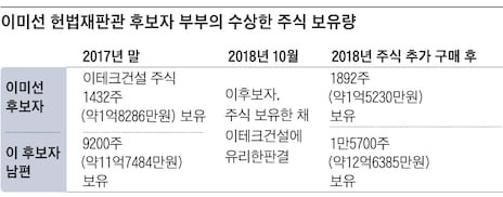 8일 자유한국당 주광덕 의원에 따르면 이 후보자는 서울중앙지법 부장판사로 근무하던 2018년 코스닥 등록사인 이테크건설의 건설 현장 설비 피해 사고 관련 재판을 담당했다. "이 건설사의 하도급 업체 과실로 정전이 발생, 설비 피해 등이 발생했기 때문에 업체 측이 배상해야 한다"며 보험회사가 제기한 민사 소송이었다. 당시 이 후보자는 이 회사 주식 1432주(약 1억8286만원어치·2017년 12월31일 기준)를 보유한 상태였다. 이 후보자의 남편 오 변호사도 2017년 말 이 회사 주식 9200주(약 11억7484만원)를 가지고 있었다.